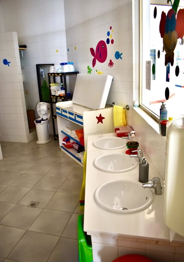 As nossas salas são amplas, arejadas e com muita luz natural. Três salas de pré-escolar e três salas de creche afetas a uma casa de banho e a uma arrecadação cada. O nosso berçário é composto por sala parque, dormitório, fraldário e copa.